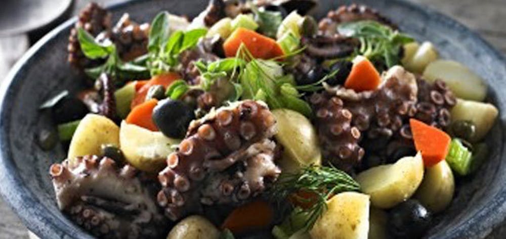 Despite common perception, grills aren’t just for steaks or other meaty favorites. So if you’re strapped for time, or simply want to spend more time mingling and less time grilling, consider putting seafood on the grill. Not only does seafood cook fast—6-8 minutes for the octopus in our Octopus Potato Salad with Black Olives and Capers, they immediately add variety and sophistication to an otherwise typical spread of grilled meats. With seafood, it’s always better to slightly undercook it otherwise it ends up rubbery and tough.