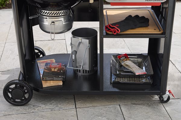 Get the performance you know and love from a Weber® kettle with ingenious space to prep, serve, and store grill essentials with the 22” Performer™ Premium Charcoal Grill. This grill is built into a premium cart with two storage shelves, a Weber Works™ side table that fits XL drop in accessories, and a Weber Works™ side rail that fits snap on accessories.* Two wheels and two locking casters make it easy to move around your space. Grill confidently for years to come with the same features as the iconic Weber® kettle including a hand-applied, porcelain-enameled finish that is scratch and rust-resistant, adjustable dampers that let you control the temperature inside the grill, and an improved One-Touch™ cleaning system that makes ash removal quick and easy. The durable, hinged cooking grate flips up on either side allowing you to easily add more fuel, and the Tuck-Away lid holder gives you a convenient place to nest the lid against the side of the bowl.