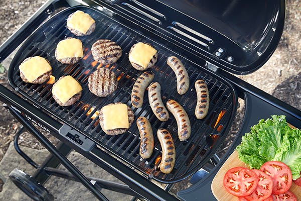 Cooking grate fits up to 15 burgers or 20 sausages.