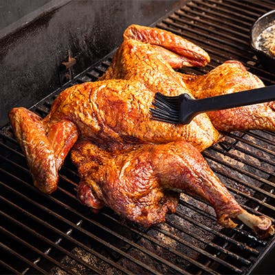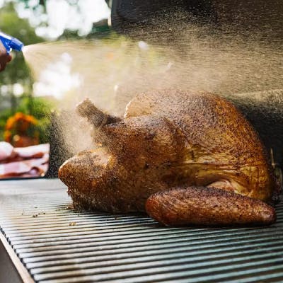 Bastes and spritzes are a great way to bring additional flavor to the turkey. Spritzing with pineapple juice is Tuffy’s go-to.